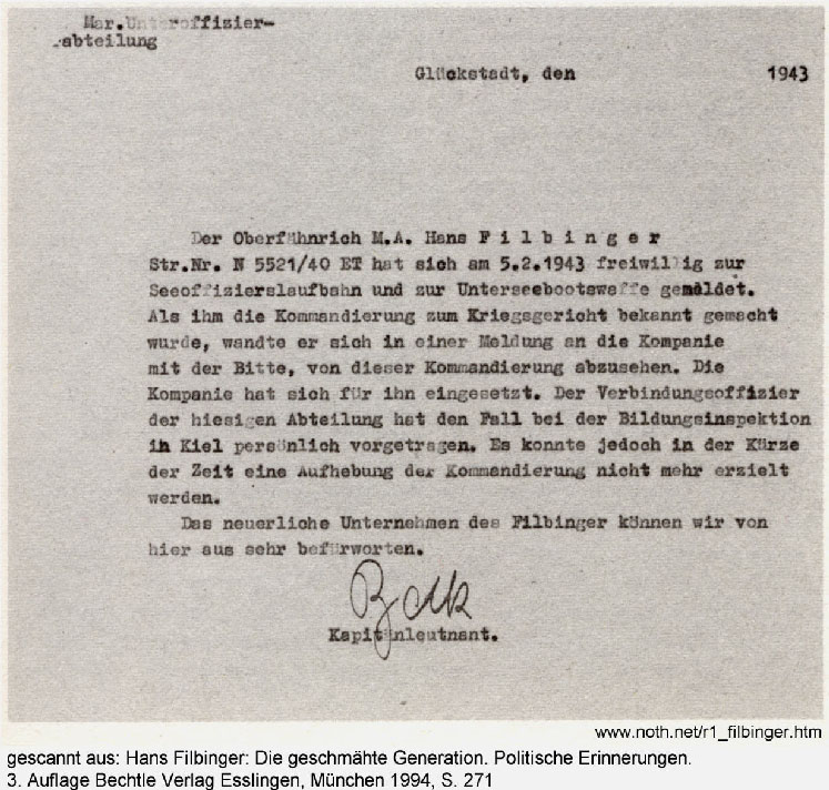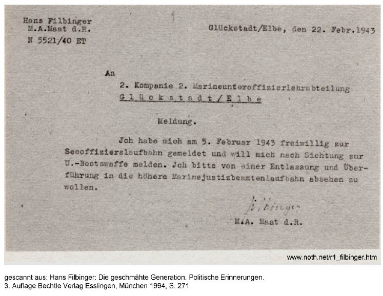 Dies würde nach einer Erklärung verlangen, wenn es in der jetzigen Pressediskussion eine Rolle spielen würde. Tut es aber nicht. Es ist zum Hochverratsprozess gegen Reinhold Schneider nicht mehr gekommen. Während die Freiburger Freunde aus dem Kreis um Färber nach und nach fast alle Verfolgungen ausgesetzt waren, geschah dem jüngsten von ihnen an der Front Dräuendes: Er wurde zur Militärjustiz abkommandiert. Diese setzte sich aus Fachleuten zusammen, die meist schon in der Weimarer Republik im Justizdienst gestanden hatten; dass man auch auf Filbinger zugreifen wollte, ist selbstverständlich. Was aber tat Filbinger? Seine Gegner - halt! Was ist denn nun ein "Gegner"? Filbinger-Gegner darf man sein, ohne sich im bewaffneten Widerstand gegen Hitler bewährt zu haben. Ein Regimegegner im Dritten Reich dagegen muss - seit der Umdefinition dieses Begriffes in den Stunden nach Oettingers Rede - im bewaffneten Widerstand gestanden haben oder sonst sein Leben aktenkundig aufs Spiel gesetzt haben. Wobei aber nur jene Akten zu beachten sind, die gerade ins politische Kalkül der Führer der jeweiligen Kampagne passen. Viele Filbinger-Gegner werden nun sagen, der Freiburger Jurist ging mit Begeisterung in den Justizdienst. Die meisten werden die Aktenlage nicht kennen oder beachten, die seine zwei Versuche zeigt, dem zu entgehen. Zwei Gesuche Filbingers, um dem Justizdienst zu entgehen Zweieinhalb Monate, nachdem Hans Filbinger zum zweiten Mal an Reinhold Schneider geschrieben hatte, meldete er sich freiwillig zur U-Boot-Waffe. Er hatte von der "Tiefe jener Welt, in der wir leben wollen" geschrieben. Mit dieser Tiefe waren selbstverständlich nicht die Tiefen des Meeres oder der nationalsozialistischen Ideologie gemeint, sondern - die des christlichen Glaubens und Geistes. Die reale Welt um ihn, in der wollte er offenbar nicht leben. So ist auch seine Meldung zur U-Boot-Waffe von ihm erklärt worden und zu verstehen als Flucht, um etwas anderem zu entgehen: Dr. Filbinger, der promovierte Jurist, wollte nicht in "die höhere Marinejustizbeamtenlaufbahn" überführt werden. Das belegen die zwei unten abgebildeten Dokumente. Filbinger schreibt dazu: