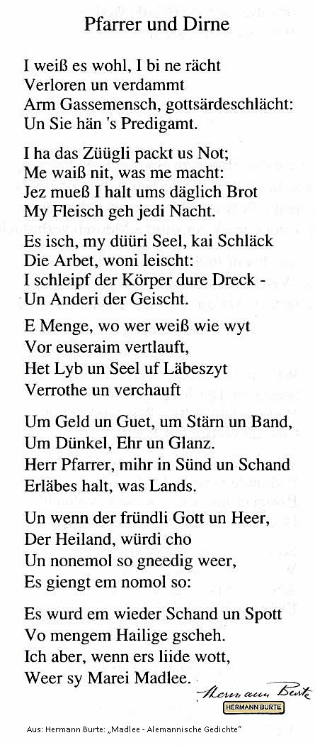 sollen hier vorgestellt Am bekanntesten und beliebtesten wurden Burtes alemannische Gedichte. Diese sind im Dialekt des Badischen Hochrheins zwischen Basel und Schopfheim geschrieben, der eng verwandt mit der Mundart der Schweizer Rheinseite ist. Die meisten dieser literarischen Kleinkunstwerke entstanden um 1913. Er konnte sie kriegsbedingt aber erst 1923 im großen Band "Madlee - Alemannische Gedichte" veröffentlichen; die Sammlung schlug in der kleinen alemannischen Literaturwelt ein wie eine Bombe. 1924 erhielt der Dichter dafür die Ehrendoktorwürde der Freiburger Universität. Literaturkritiker stellten ihn neben Johann Peter Hebel, dem Nestor der alemannischen Dialektdichtung. Er war von den 20er bis in die 70er, 80er Jahre der bekannteste und beliebteste alemannische Dichter und wurde im 20. Jahrhundert von niemandem erreicht. Sein Ansehen sank aber nach langandauern, meist in der Presse ausgetragenen politischen Kampagnen. Von Hause aus war Hermann Burte Konservativer und später Deutschnationaler, doch mit seiner schließlichen Verstrickung im Nationalsozialismus wurde er zur Zielscheibe seiner meist linken Feinde der Nachkriegsjahrzehnte. Gedenkstein auf dem Friedhof in Maulburg Seine hochdeutschen Gedichte sind heute ein zu Unrecht wenig beachteter Schatz. Rainer Maria Rilke war von der Entwicklung Burtes begeistert; er schrieb 1924: "Ein Gedicht wie diese 'Himmlische Ernte', ist ein allgemeiner deutscher Besitz, ein Gut von solcher Reinheit und Gnade, daß es für sich allein ausreicht, den gründlichen Reichtum des Dichters für immer zu erweisen." |