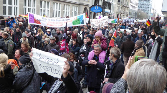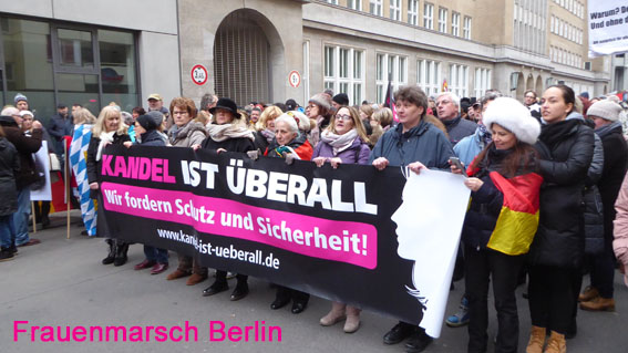 Am 17. Februar 2018 gab es in Berlin einen Frauenmarsch gegen die offenen Grenzen Merkels und die Morde, Vergewaltigungen und Übergriffe von sogenannten “Flüchtlingen“ besonders gegen Frauen und Mädchen. Mit weit über 1000 Teilnehmerinnen und Teilnehmern ist dieser Marsch in der Höhle des Löwen, im rot-rot-grünen Berlin, als grandioser Erfolg anzusehen. Daran ändert auch die Tatsache nichts, dass die Hilfstruppe Merkels, die Antifa, die Demo blockieren konnte. Die zahnlos gemachte Polizei konnte, wollte, sollte, durfte ???? die hunderten linksextremen und grünen Störer nicht konsequent beiseite räumen, sodass die Frauendemo in der Kälte über 2 Stunden stecken blieb. Ein Teil der Kundgebung wurde dann notgedrungen an der Blockade am Checkpoint Charlie abgehalten. Nach der Beendigung dort gelang es kleinen Gruppen, doch noch zum Kanzleramt durchzudringen und eine Abschlusskundgebung zu machen. Hut ab vor diesen Frauen und Männern. Die Demonstration war überparteilich; dazu aufgerufen hatte die aus dem türkischen Kurdistan stammende Leyla Bilge; unter den Rednern waren sie und die im Iran gebürtige Laleh Hadjimohamadvali, der aus den Libanon kommende Imad Karim und der Grieche Alexander Tassis. Die Antifa und die Medien waren sich aber dennoch nicht zu blöde dafür, dieser Demo vorzuwerfen, unter dem Deckmantel des Feminismus Rassismus betreiben zu wollen. Der nächste Vorwurf war, das sei eine AfD-Demo. Und wenn das so wäre? Doch in diesem Fall stimmt es nicht einmal. Zwar waren viele der Teilnehmerinnen und Teilnehmer AfD-Mitglieder, darunter auch Bundestags- und Landtagsabgeordnete. Aber man nennt doch auch einen katholischen Kirchentag nicht eine CDU-Kundgebung oder einen evangelischen nicht ein grünes Treffen, obwohl dort viele der entsprechenden Politiker und Mitglieder dabei sind. Und eine Gewerkschaftskundgebung ist keine SPD-Demonstration. Wer so etwas dennoch behauptet, betreibt billige und durchsichtige Polemik. Angesichts